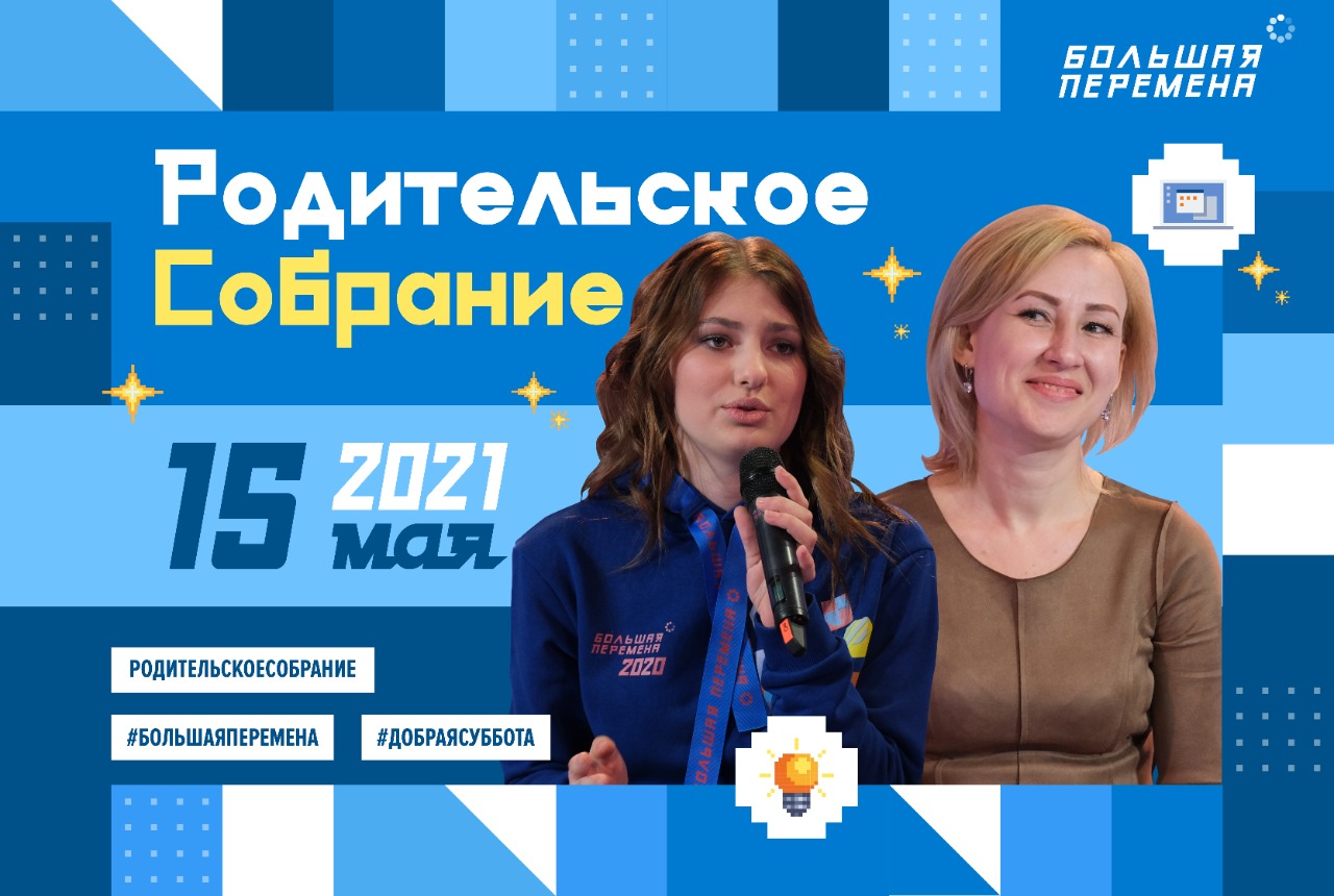 15 мая 2021 года в рамках Доброй субботы будет проведено «Родительское собрание наоборот», в рамках которой обучающиеся расскажут своим родителям или педагогам о конкурсе «Большая перемена» и современных технологиях, используемых для образования и саморазвития.