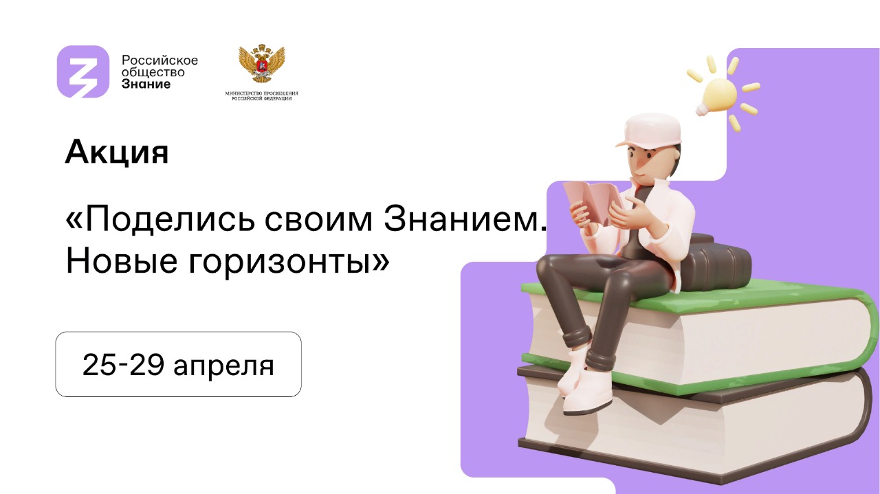 С 25 по 29 апреля 2022 года Министерство просвещения Российской Федерации совместно с Российским обществом «Знание» проводят вторую Всероссийскую акцию «Поделись своим Знанием. Новые горизонты».