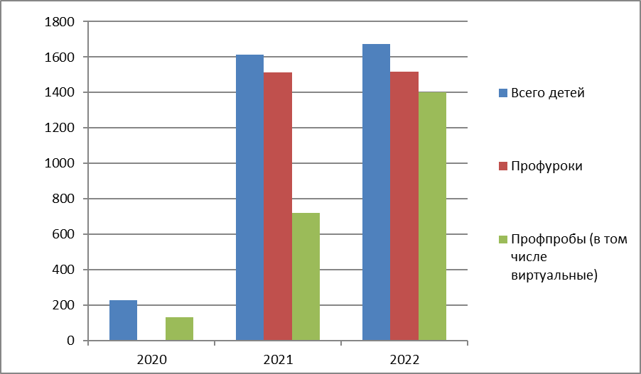 Кроме того, в 2022 году на платформе bvbinfo.ru появилась возможность участия обучающихся в виртуальных мероприятиях проекта. Так, в виртуальной выставке "Лаборатория будущего" приняли участие более 1000 детей, а в виртуальных профпробах – около 700.