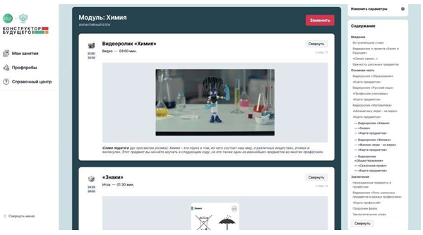 «Работать с заменами блоков оказалось не сложно. Сначала читала инструкции, а потом уже всё получалось «на автомате» - говорит Инга, - «В каждом блоке есть занимательное видео про предмет и профориентационная игра, которую можно провести в классе. Меняешь – предмет, меняется видео и игра». Педагог изучила контент разных предметов и остановилась на химии. Про неё рассказывает анимированный 3D персонаж.
